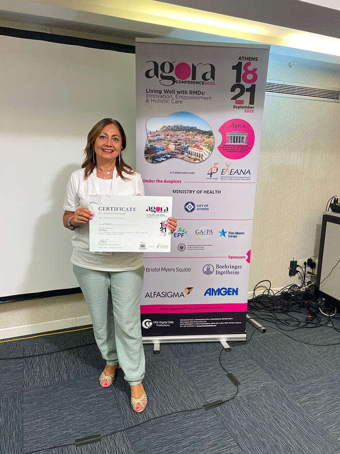 Un prestigioso ‘bronzo’ sul podio, è stato conseguito al “Best practice Award” conferito durante la AGORA Conference 2025 tenutasi ad Atene. Il riconoscimento è andato al progetto “Vocabolario della reumatologia” presentato da APMARR. Ha ritirato il premio Marinella Rizzo (foto qui sotto).