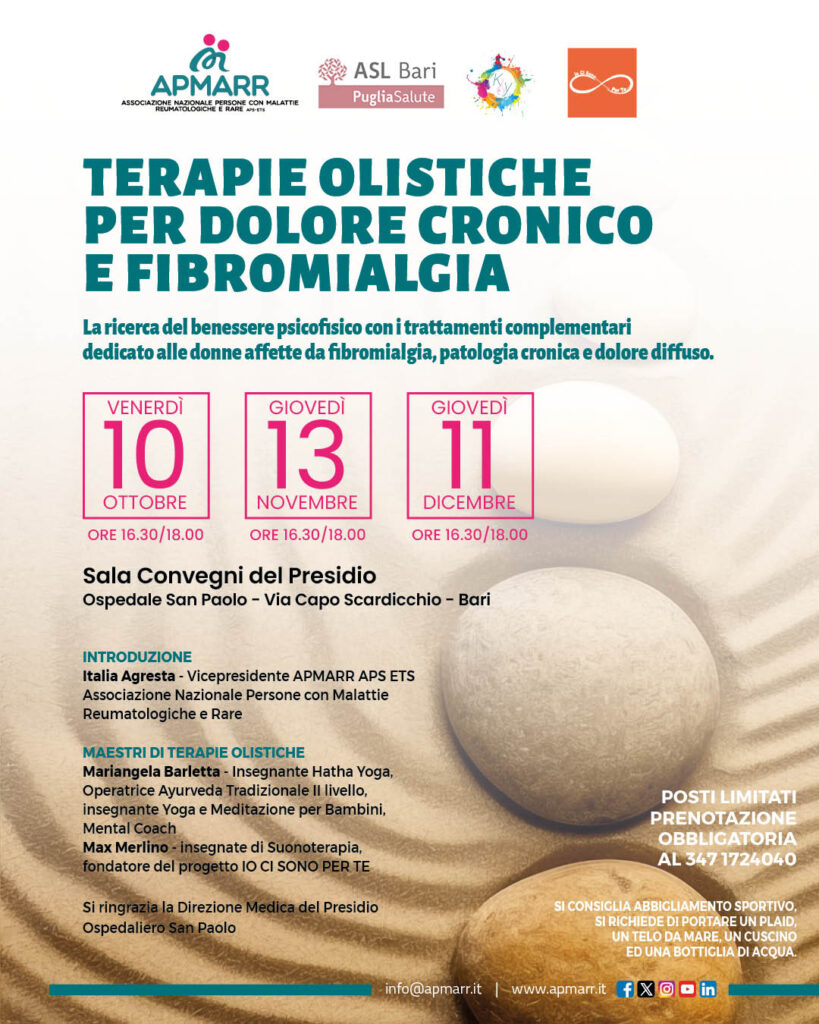 Giovedì 13 novembre dalle 16:30 alle 18.00 presso la Sala Convegni del Presidio dell’Ospedale San Paolo di Bari, si terrà “Terapie olistiche per dolore cronico e fibromialgia – la ricerca del benessere psicofisico con i trattamenti complementari dedicati alle donne con fibromialgia, patologia cronica e dolore diffuso.”